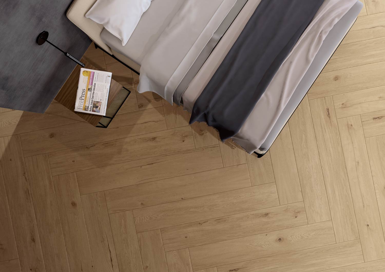Moderne, schlanke Riegelformate in naturnaher Holzanmutung eignen sich ideal für klassische Parkett-Verlegemuster wie Fischgrät oder Schiffsboden. In XL-Ausführung schaffen Holzfliesen im Dielenformat ein perfektes Landhausflair.